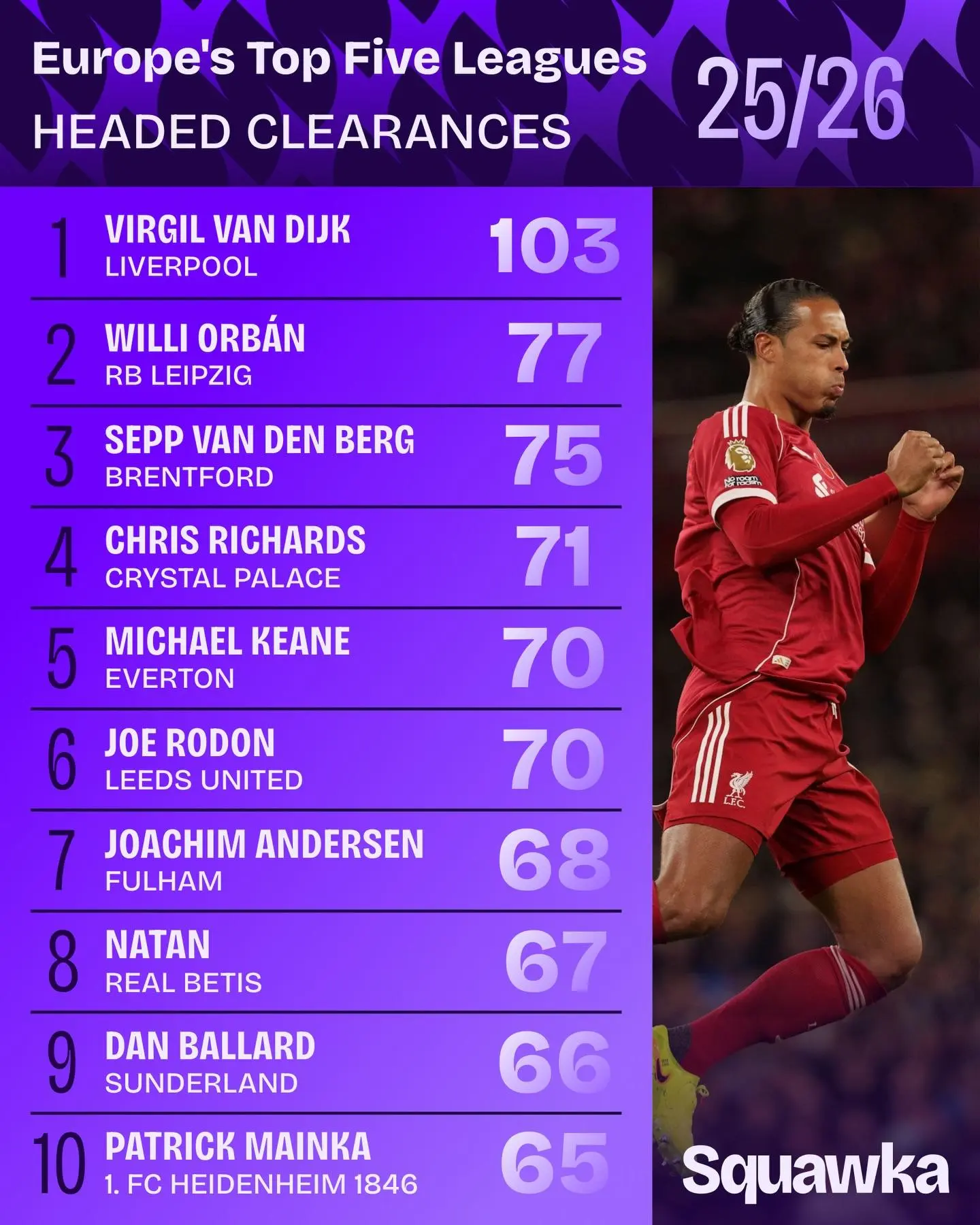 Squawka數(shù)據(jù)統(tǒng)計(jì),解圍范戴克成為了本賽季至今歐洲五大聯(lián)賽中首位完成100次頭球解圍的范戴球員(103次),比其他任何球員都多出26次??吮?/p>來(lái)源:X