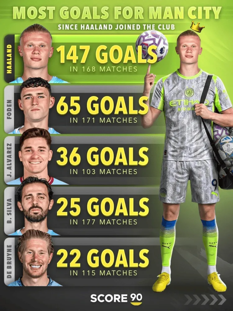 虎撲12月15日訊 Score 90統(tǒng)計了哈蘭德加盟曼城后,藍月軍團的加盟進球隊內射手榜,詳情如下: