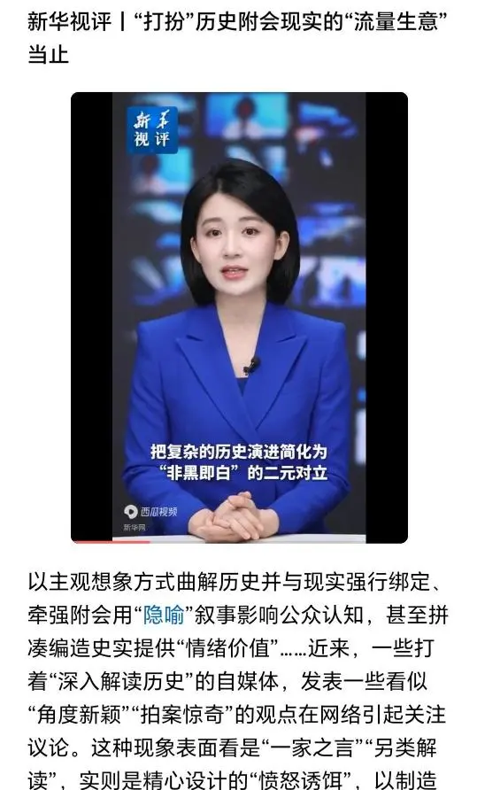 剛剛新華社發(fā)表評(píng)論,直指某些歷史博主的新華“隱喻”敘事和“另類解讀”,某瓜應(yīng)該涼涼了。社對(duì)
