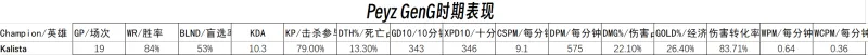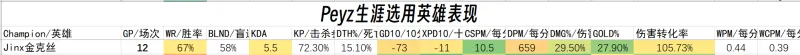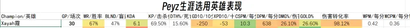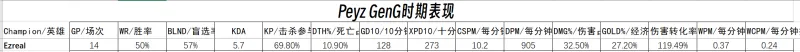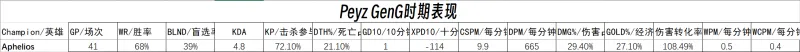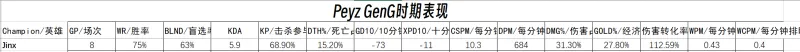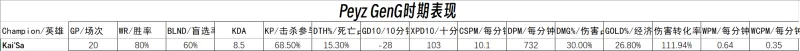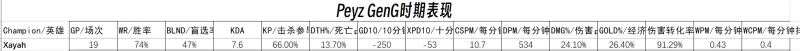 這就正常多了嘛!勝率依然可觀,KDA有所下降,這個對線表現(xiàn)數(shù)據(jù)我還去復查了一下,真是這樣,如果數(shù)據(jù)沒問題的話只能說明peyz的打線水平的確堪憂,DPM能夠追平GEN時期說明后續(xù)補傷害的能力確實還行。