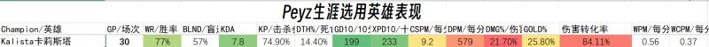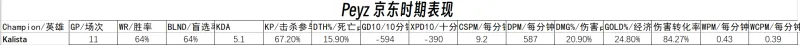 1.招牌英雄三個,卡莎、澤麗、卡莉斯塔(EZ這個待定),當玩到這三個具有位移的高機動英雄時,peyz的發(fā)揮非常亮眼,能夠接管比賽。