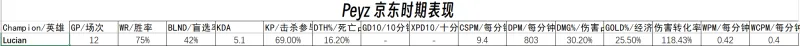 12場勝率75%,先手率42%,KDA5.1,擊殺參與69%,死亡占比16.2%,分均補刀9.4,DPM803,傷害占比30.2%,經(jīng)濟占比25.5%,傷轉(zhuǎn)118.43%。
