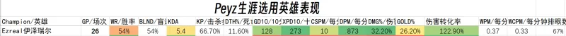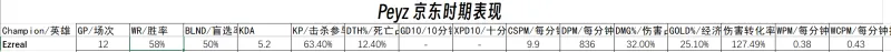 EZ這個破英雄打硬仗能力就是不行,刷了這么多傷害有啥用呢,勝率只能54%。不過好消息是peyz玩EZ這英雄終于對線大領先了。