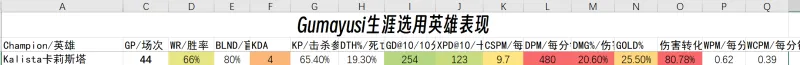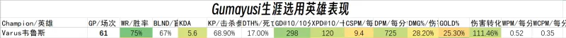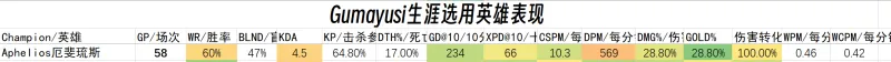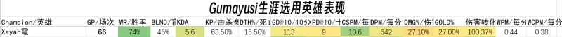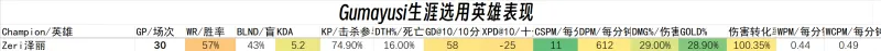 Guma玩的最多的英雄,66場勝率74%,先手率45%,KDA5.6,擊殺參與63.5%,死亡占比15.5%,10分鐘經(jīng)濟領先113,10分鐘經(jīng)驗領先9,分均補刀10.6,DPM642,傷害占比27.1%,經(jīng)濟占比27%,傷轉(zhuǎn)100.37%。