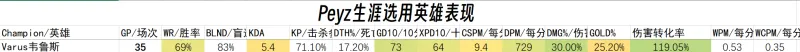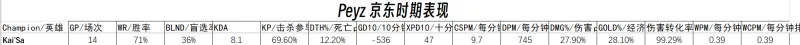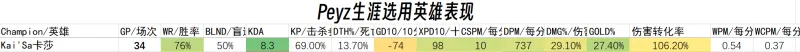 卡莎大王,peyz的最自信英雄,34場勝率76%,先手率50%,KDA8.3,擊殺參與69%,死亡占比13.7%,10分鐘經(jīng)濟領先-74,10分鐘經(jīng)驗領先98,分均補刀10,DPM737,傷害占比29.1%,經(jīng)濟占比27.4%,傷轉(zhuǎn)106.2%。特別數(shù)據(jù):3次penta kill