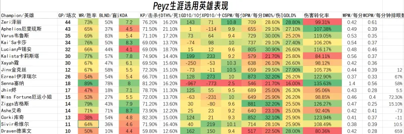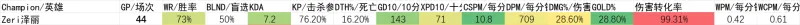 可以看出來,澤麗是Peyz的招牌英雄之一,從數(shù)據(jù)上來看,屬于上游水平,無論是對線還是團戰(zhàn)表現(xiàn)都比較一般,特別是綜合的傷轉(zhuǎn)甚至不到100%,作為一個后期大核有點不應該了。