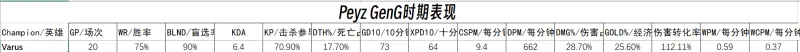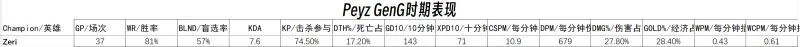 在GEN期間勝率很好看,和guma一樣,但還是老問題,強線權英雄壓刀和壓經(jīng)驗一般,在和guma的對比下遜色太多,T1也是很需要先手搶韋魯斯來保障下路對線壓制的,如果peyz只能是這個水平那對T1還是有一些影響的。