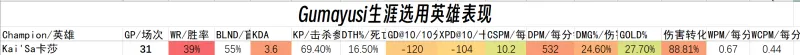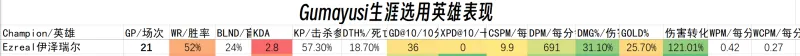 雖然英雄不行,但是guma玩的也是真不行,21場勝率52%,先手率24%,KDA2.8,擊殺參與57.3%,死亡占比18.7%,10分鐘經(jīng)濟領先36,10分鐘經(jīng)驗領先0,分均補刀9.9,DPM691,傷害占比31.1%,經(jīng)濟占比25.7%,傷轉(zhuǎn)121.01%。