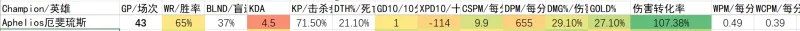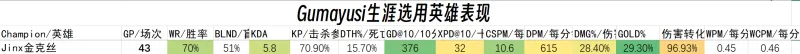 43場勝率70%,先手率51%,KDA5.8,擊殺參與70.9%,死亡占比15.7%,10分鐘經(jīng)濟領先376,10分鐘經(jīng)驗領先32,分均補刀10.6,DPM615,傷害占比29.4%,經(jīng)濟占比29.3%,傷轉(zhuǎn)96.93%。