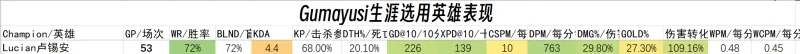 盧錫安是guma早期招牌英雄之一了,勝率非常不錯,KDA表現(xiàn)一般,但是對線打的很好,傷害打的也很好。