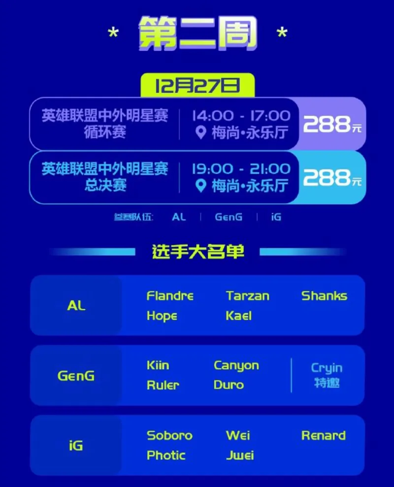 虎撲12月15日訊 濮院電競節(jié)英雄聯(lián)盟項目中外明星賽賽程和名單: