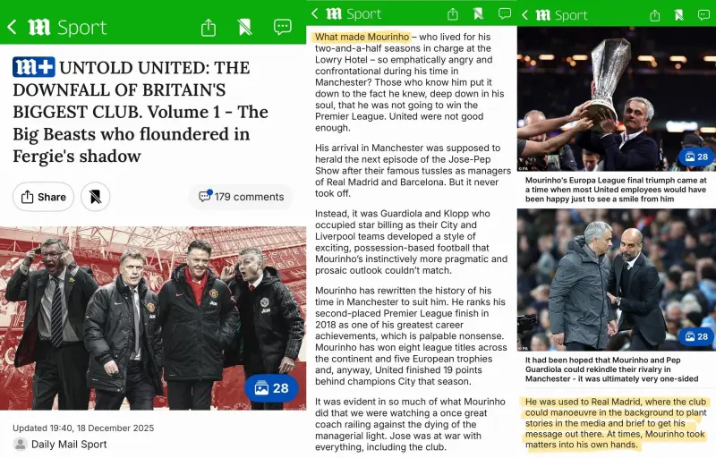 2025-12-15《每日郵報(bào)Daily Mail》記者團(tuán)隊(duì)獨(dú)家披露共五章節(jié)的「曼聯(lián)秘史」,揭開曼聯(lián)的衰落之謎,自2013年弗格森卸任曼聯(lián)主帥后的慘烈墜落細(xì)節(jié),同時(shí)也探討了曼聯(lián)是否還有機(jī)會(huì)走出絕境。其中提及穆里尼奧做為曼聯(lián)主帥的秘事。
