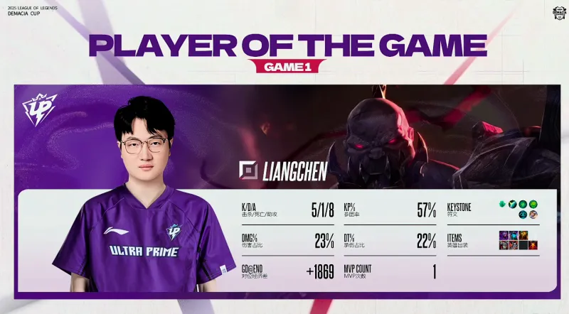 [流言板]Liangchen賽恩打出5/1/8的戰(zhàn)績,拿下UP對戰(zhàn)LNG首局MVP