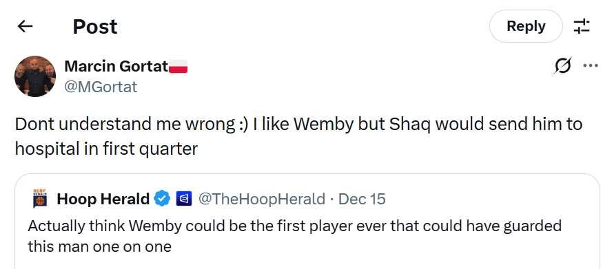 虎撲12月17日訊 美媒Hoop Herald發(fā)布了一條沙奎爾-奧尼爾的扣籃集錦,配文:我真的愛(ài)文認(rèn)為文班亞馬會(huì)是歷史首個(gè)能一對(duì)一單防他的人。