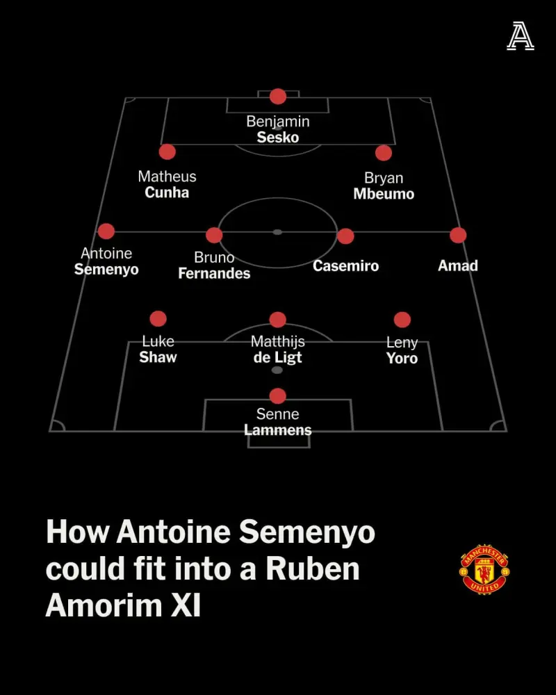 他的進(jìn)球威脅和雙腳均衡能力可以讓他覆蓋阿莫林首發(fā)陣容中的多個(gè)角色。在阿莫林的體系中,最有趣的用法是將他部署在左翼衛(wèi)位置。這將使主教練能夠在邊路部署兩名進(jìn)攻型球員,以拉開防線并在攻防轉(zhuǎn)換中制造問題。