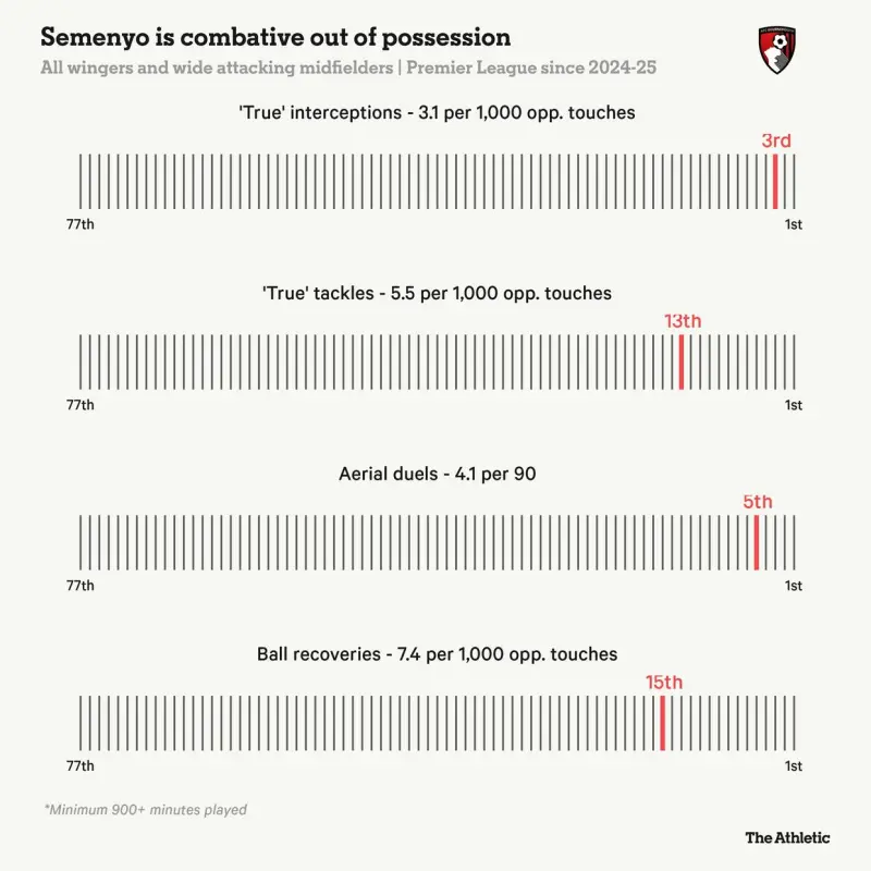 在防守方面,與許多英超頂級邊鋒相比,他在無球跑動(dòng)和壓迫時(shí)的表現(xiàn)也相當(dāng)出色。作為伊勞拉麾下高位壓迫體系的一部分,塞門約更像是一個(gè)主動(dòng)出擊型的防守者,旨在從觸球過重或靠近己方禁區(qū)時(shí)未觀察周圍情況的對手腳下斷球。