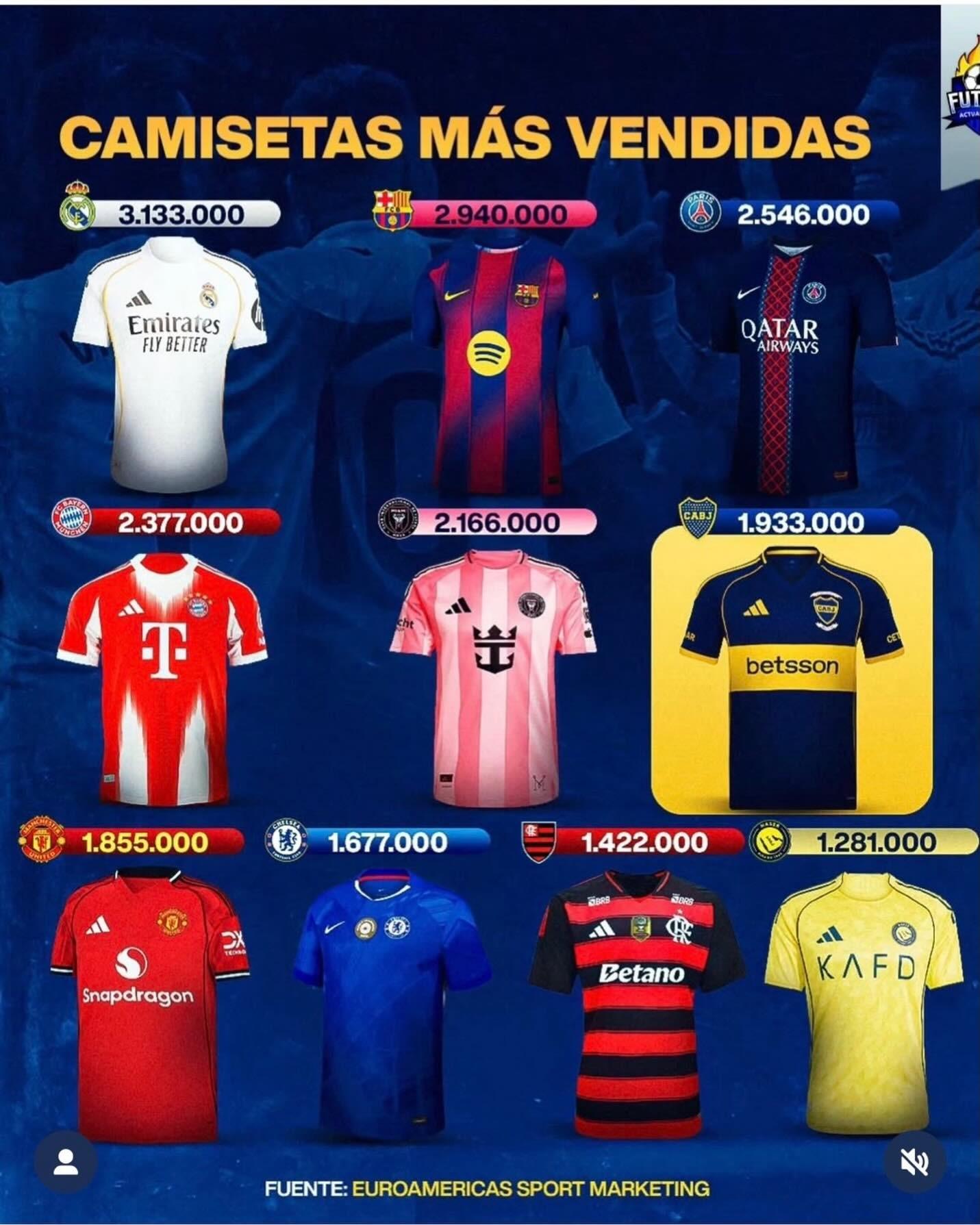 在這場“球衣國家德比”中,巴塞羅那2,940,000件的銷量位居次席,巴黎圣日耳曼則以2,546,000 件排名第三。全球球衣銷量前十的俱樂部還包括:拜仁慕尼黑、邁阿密國際、博卡青年、曼聯(lián)、切爾西、弗拉門戈以及利雅得勝利。從地域分布來看,歐洲球隊(duì)占據(jù)6席,南美2席,美國和沙特各占1席。