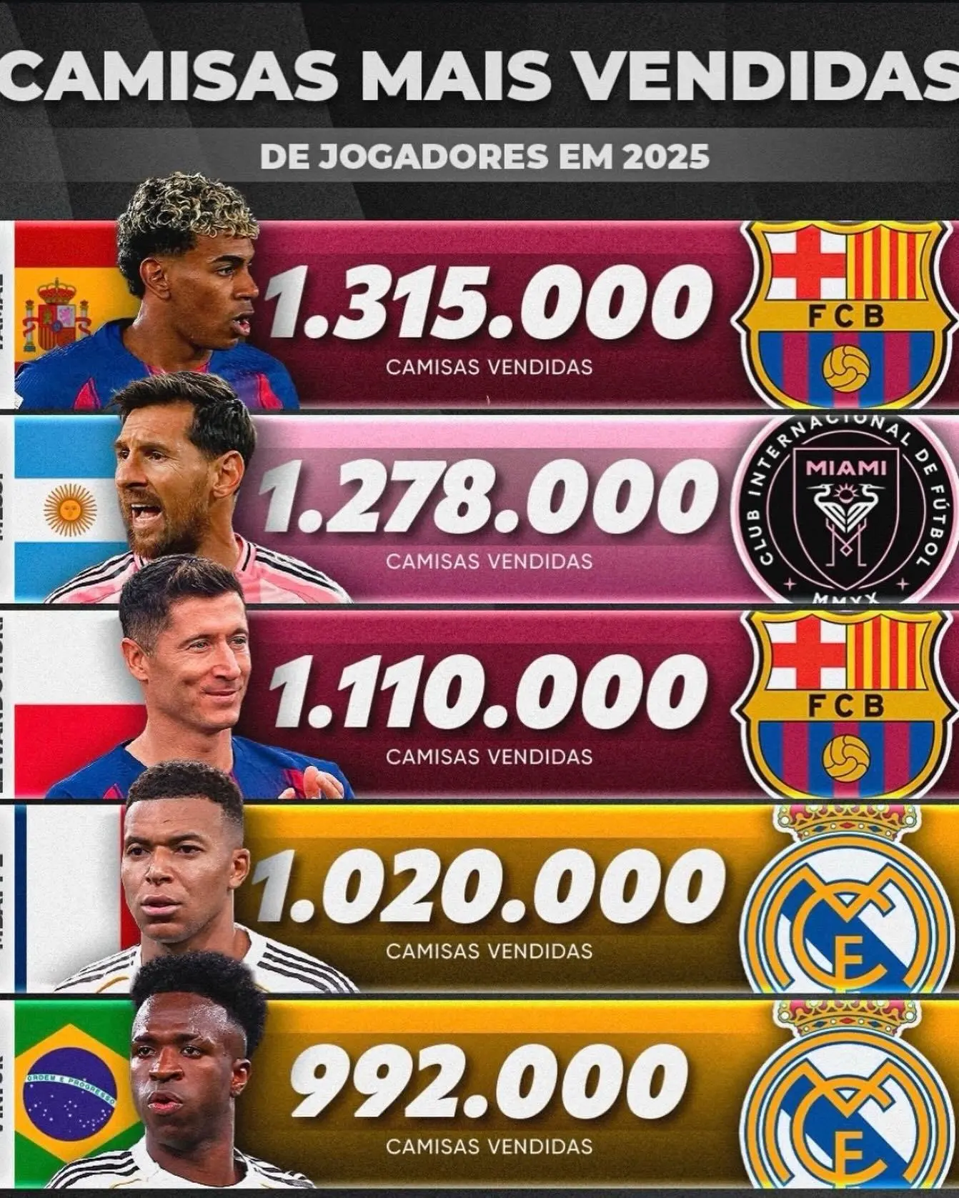 盡管皇馬在俱樂部層面一騎絕塵,但在球員個(gè)人球衣銷量榜上,領(lǐng)跑的卻是巴薩新星亞馬爾。這位18歲的西班牙國腳在2025年共售出1,320,000件個(gè)人球衣,高居全球第一。梅西1,280,000件隨其后,萊萬則以1,110,000件排名第三。