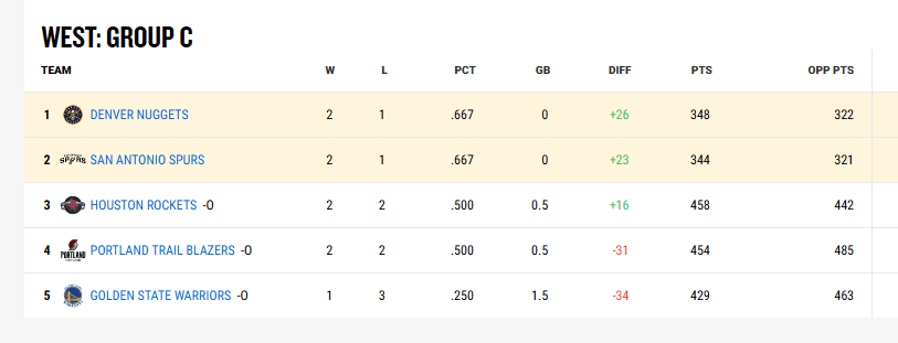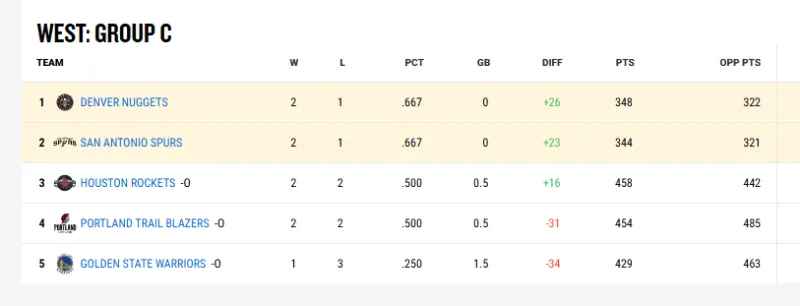 目前C組掘金和馬刺各為2勝1負(fù),最后一場雙方交手的勝者將晉級(jí)淘汰賽。