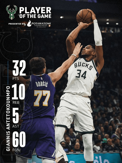 本場比賽,海報雄鹿隊球員揚尼斯-阿德托昆博出場31分鐘,投籃15中9,其中三分球1中1,得到32分10籃板5助攻1蓋帽。