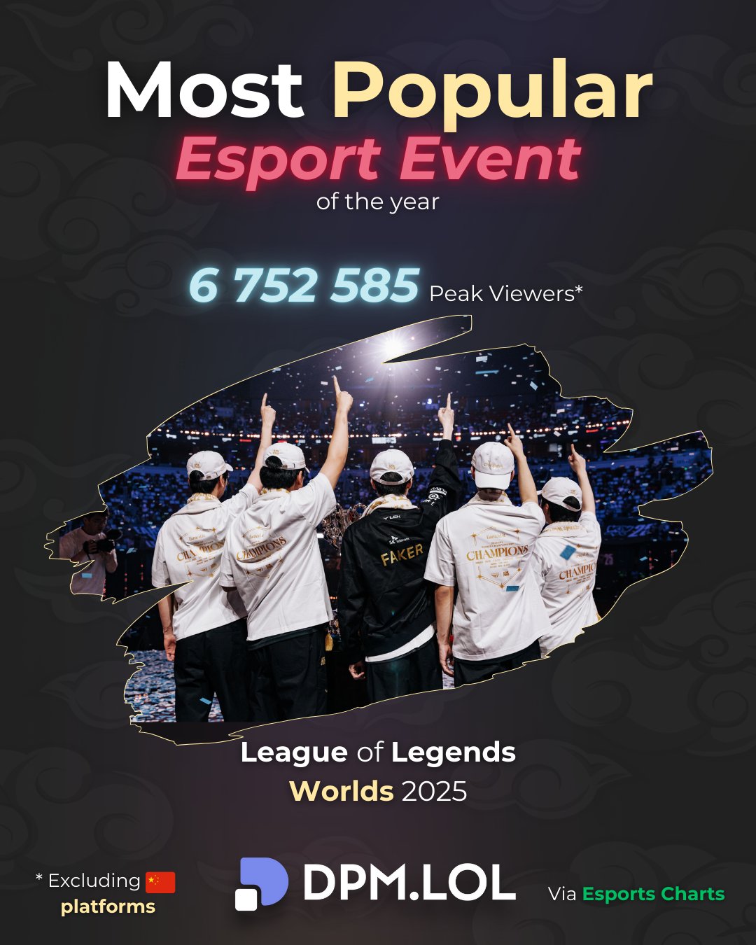 虎撲12月24日訊 外媒統(tǒng)計(jì)2025年度最受歡迎的電子競(jìng)技賽事為2025全球總決賽,最高觀眾峰值為6752585人(不包含大陸地區(qū)數(shù)據(jù))。媒統(tǒng)