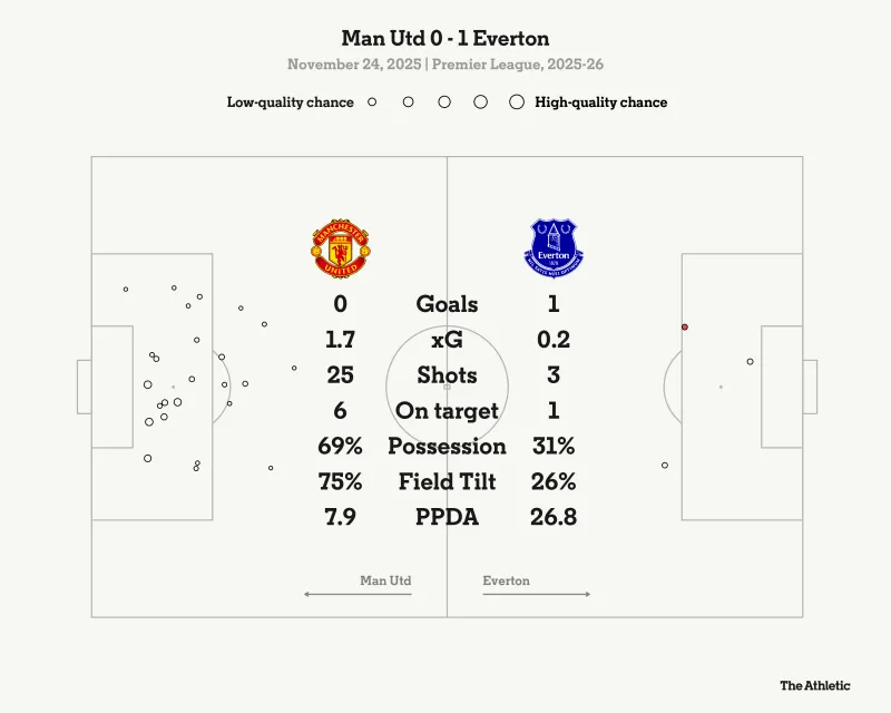 全場(chǎng)比賽曼聯(lián)完成25次射門(mén),埃弗頓僅3次,其中曼聯(lián)創(chuàng)造4次絕佳機(jī)會(huì),埃弗頓則是0。曼聯(lián)的預(yù)期進(jìn)球數(shù)為1.66,遠(yuǎn)超埃弗頓的0.23。但面對(duì)一支少打1人長(zhǎng)達(dá)80分鐘的球隊(duì),曼聯(lián)大部分時(shí)間里進(jìn)攻乏力,最終遭遇一場(chǎng)損失慘重的失利。