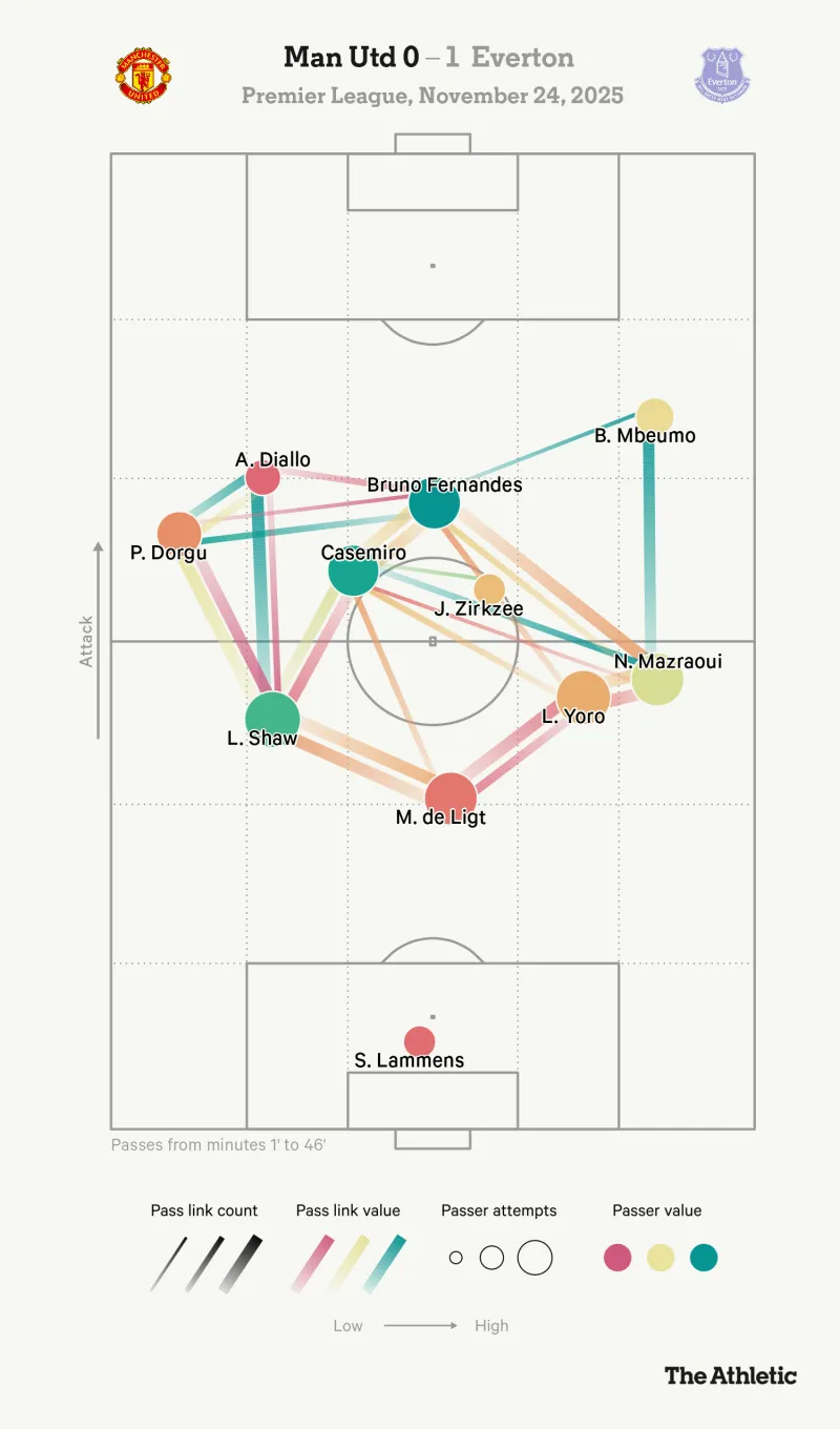 下半場(chǎng),曼聯(lián)在埃弗頓半場(chǎng)的控球時(shí)間更長(zhǎng)、主導(dǎo)性更強(qiáng),比賽看似回歸了11打10的正常節(jié)奏。但頗具諷刺意味的是,這種局面似乎反而讓阿莫林的球員們更加不適。