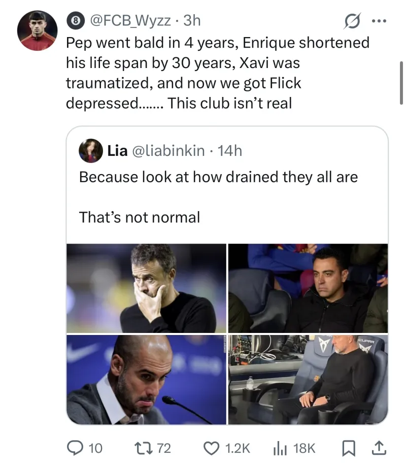 昨晚賽后在X上傳播很廣 看了那個(gè)視頻感覺弗里克抑郁了一樣 拉菲和他聊完之后還一臉郁悶的弗里坐著(圖一)感覺巴薩主教練真的是難做啊
