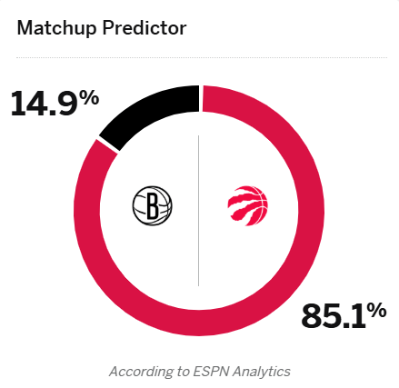 賽前,賽猛美媒ESPN預(yù)測本場比賽,達(dá)籃猛龍勝率高達(dá)85.1%,網(wǎng)勝籃網(wǎng)勝率僅14.9%。流言龍勝率高率僅