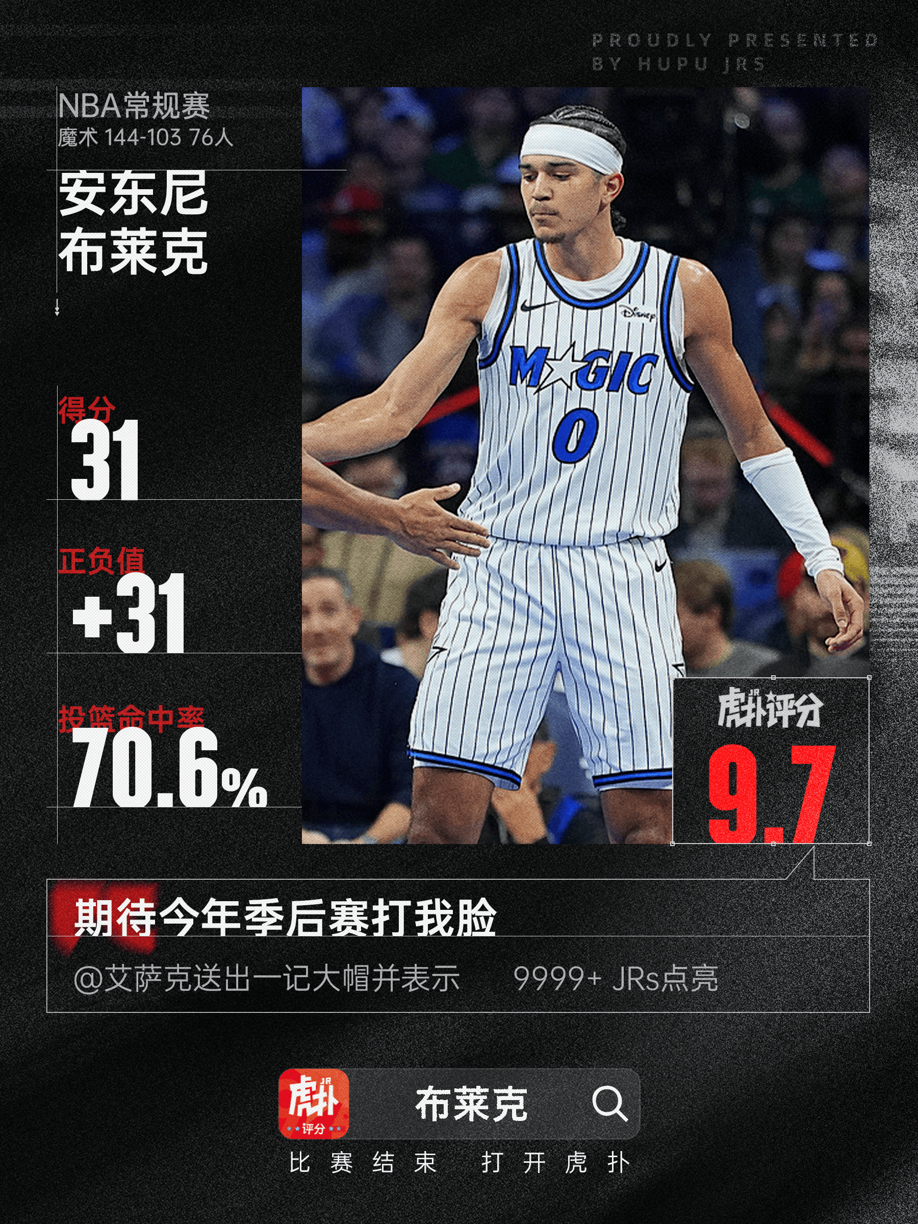 本場(chǎng)比賽,魔術(shù)球員安東尼-布萊克出戰(zhàn)27分鐘,17投12中,其中三分球6投4中,罰球4投3中,得到31分1籃板3助攻1搶斷。