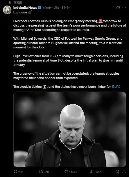 “獨(dú)家爆料:據(jù)可靠消息源透露,利物浦將于明天召開緊急會(huì)議,專題討論球隊(duì)近期糟糕的表現(xiàn)以及主教練斯洛特的未來。