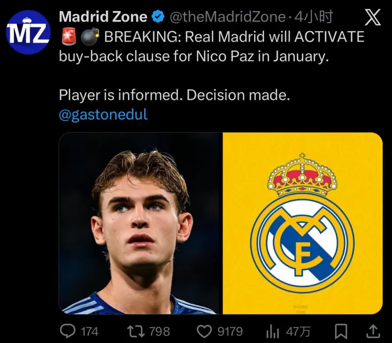 阿根廷Tyc記者gastonedul:皇家馬德里將在一月份激活回購(gòu)條款,簽回尼科·帕斯。球員已被告知,決定已作出。