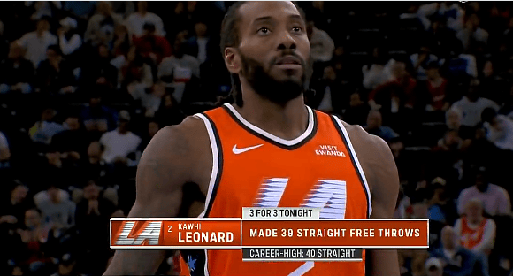 第四節(jié)比賽中,已連倫納德上罰球線兩罰全中,續(xù)命本賽季已經(jīng)連續(xù)命中43個(gè)罰球,罰球罰球刷新生涯連續(xù)罰球命中數(shù)新紀(jì)錄,此前連續(xù)40個(gè)。