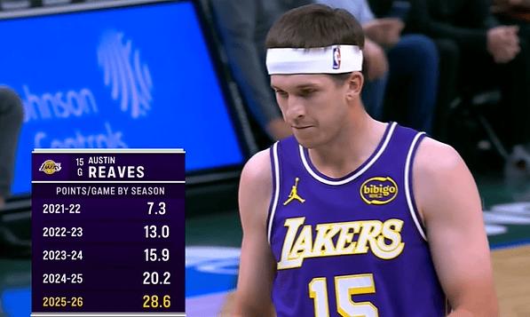 比賽第一節(jié),斯生轉(zhuǎn)播鏡頭給出里夫斯進(jìn)入聯(lián)盟以來每年的涯場場均得分: