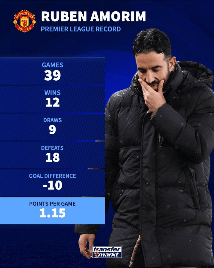 虎撲11月25日訊 在阿莫林上任曼聯(lián)主教練一周年之際,德轉(zhuǎn)網(wǎng)站盤點(diǎn)了他接手球隊(duì)以來的英超數(shù)據(jù)。過去這一年里,阿莫林帶隊(duì)出戰(zhàn)聯(lián)賽39場(chǎng),僅取得12勝9平18負(fù),場(chǎng)均拿分只有1.15分,凈勝球?yàn)?10,各項(xiàng)關(guān)鍵指標(biāo)都難言理想。
