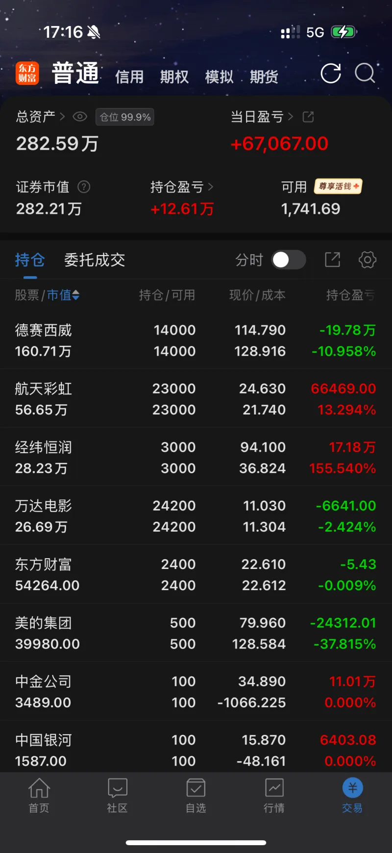 智駕:現在普通戶德賽只套10%了,這禮拜如果能有持續(xù)性那就有望回水上了。信用戶的德賽已經回本,不過怕了這個主力了買的不太多,只融了80w這樣子。經緯走的也蠻離譜的,今天12%的漲幅跌回2%回撤,這是在做什么看不懂了,不過這個票走勢跟德賽的,暫時先不動了。兩個票都是放量沖高回落,本身寄往也不大,今天表現還算能接受了,希望今天是借大盤洗盤,未來能走出持續(xù)性。這個板塊我現在沒什么操作的空間,搞得那么被動只能看天吃飯了。