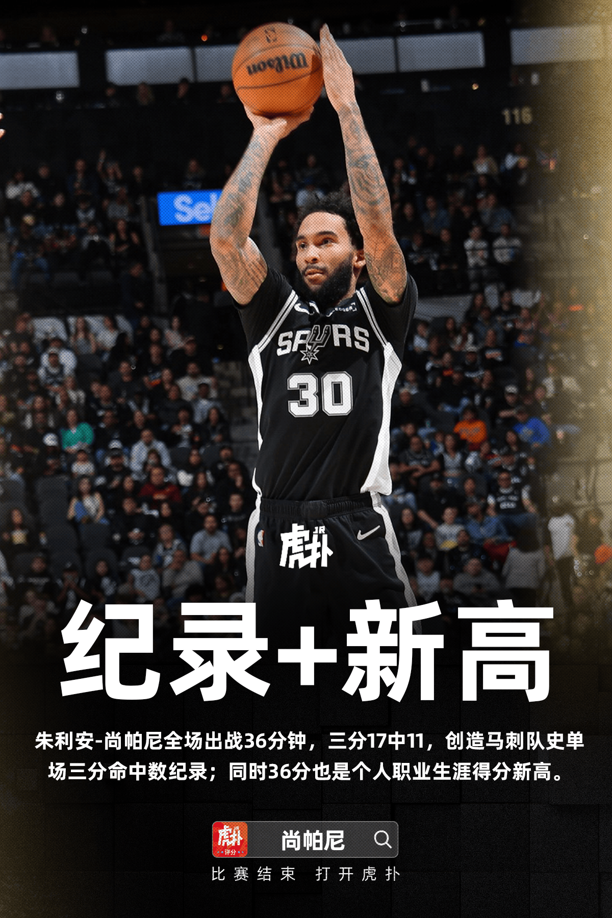 馬刺球員朱利安-尚帕尼全場出戰(zhàn)36分鐘,破記帕尼17投11中,三分17中11、罰球3中3得到36分6籃板1蓋帽,創(chuàng)造馬刺隊史單場三分命中數(shù)記錄、個人職業(yè)生涯得分新高。