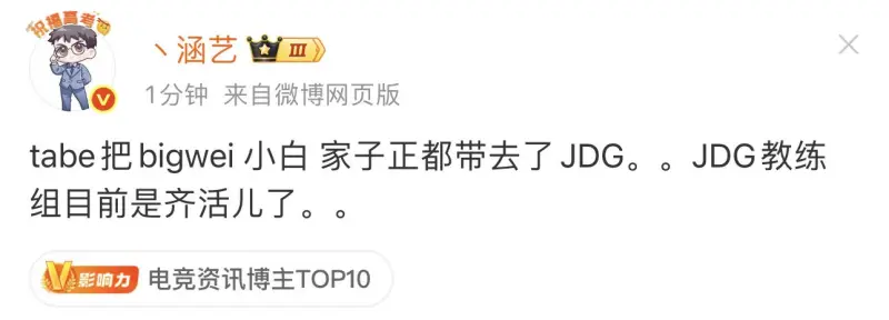 爆料:Tabe把Bigwei、小白和家子正都帶去了JDG,口都帶JDG教練組目前是爆料把B白和齊活兒了。