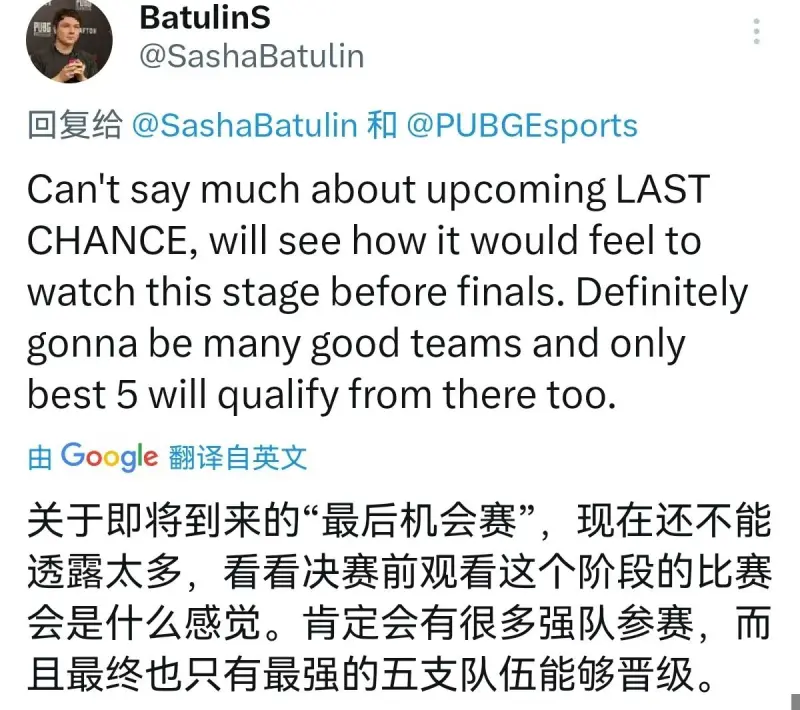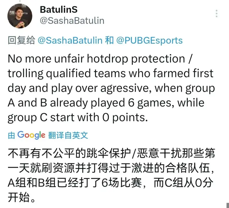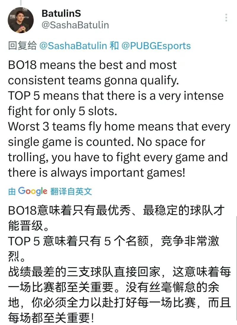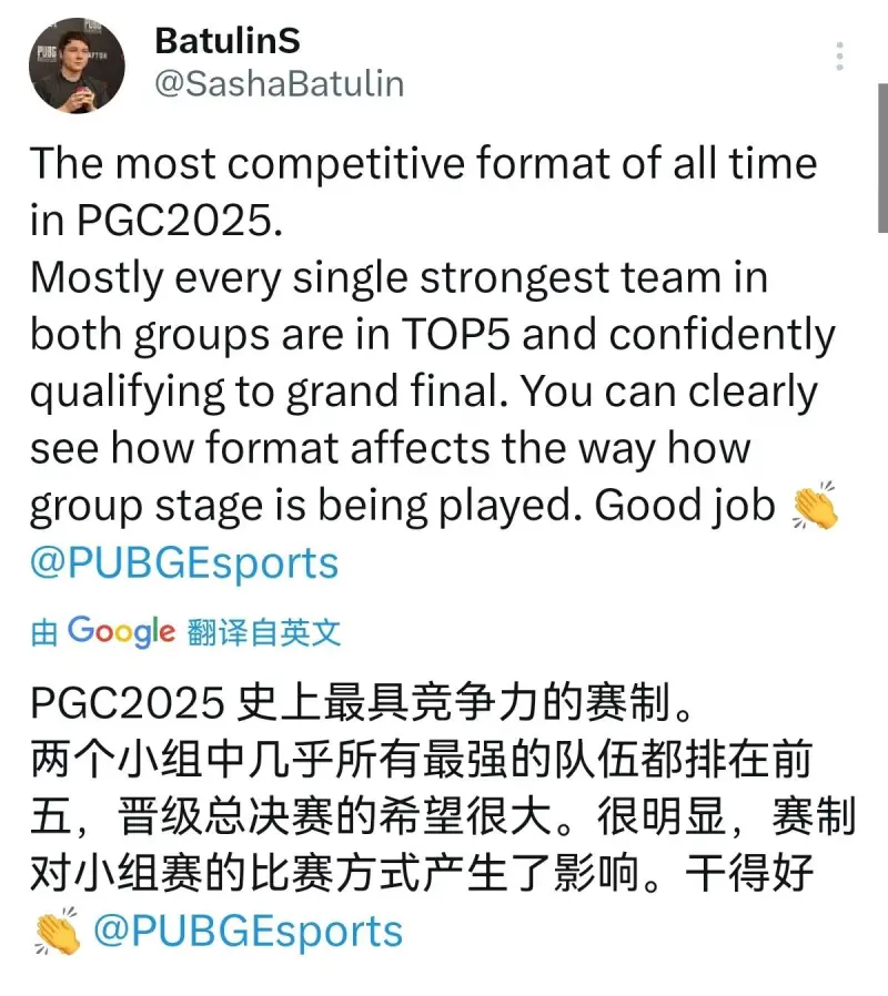 Batulins:PGC2025 史上最具競(jìng)爭(zhēng)力的賽制,兩個(gè)小組中幾乎所有最強(qiáng)的隊(duì)伍都排在前五,晉級(jí)總決賽的希望很大。很明顯,賽制對(duì)小組賽的比賽方式產(chǎn)生了影響。干得好!BO18意味著只有最優(yōu)秀、最穩(wěn)定的戰(zhàn)隊(duì)才能晉級(jí)。不再有不公平的跳傘保護(hù)/惡意干擾那些第一天就刷資源并打得過于激進(jìn)的合格隊(duì)伍,A組和B組已經(jīng)打了6場(chǎng)比賽,而最后機(jī)會(huì)組從0分開始。關(guān)于即將到來的“最后機(jī)會(huì)賽”現(xiàn)在還不能透露太多,看看決賽前觀看這個(gè)階段的比賽會(huì)是什么感覺??隙〞?huì)有很多強(qiáng)隊(duì)參賽,而且最終也只有最強(qiáng)的五支隊(duì)伍能夠晉級(jí)。