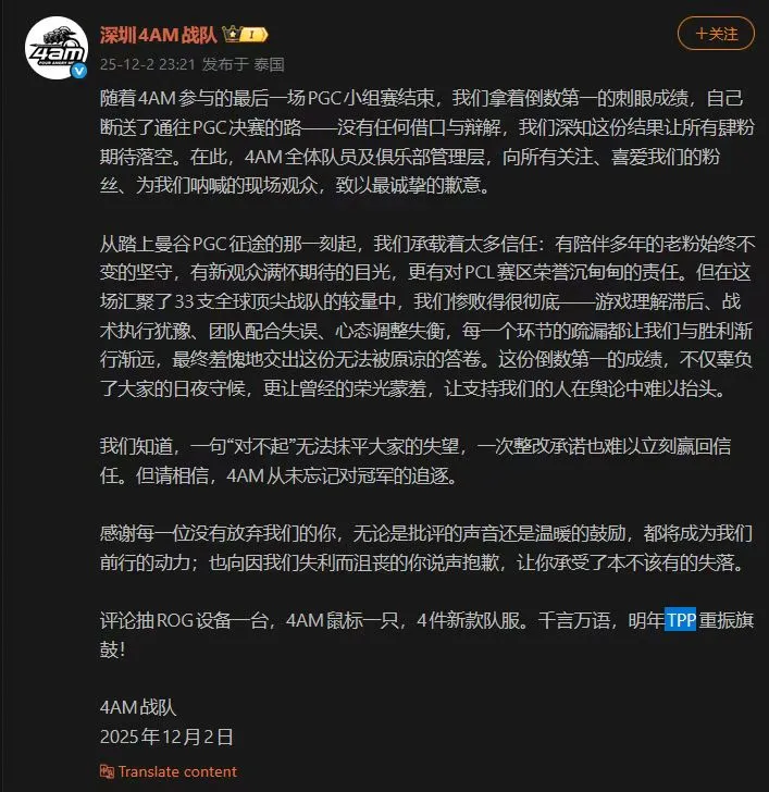 4AM:隨著4AM參與的最后一場(chǎng)PGC小組賽結(jié)束,我們拿著倒數(shù)第一的刺眼成績(jī),自己斷送了通往PGC決賽的路--沒有任何借口與辯解,我們深知這份結(jié)果讓所有肆粉期待落空。在此,4AM全體隊(duì)員及俱樂部管理層,向所有關(guān)注、喜愛我們的粉絲、為我們吶喊的現(xiàn)場(chǎng)觀眾,致以最誠(chéng)摯的歉意。
