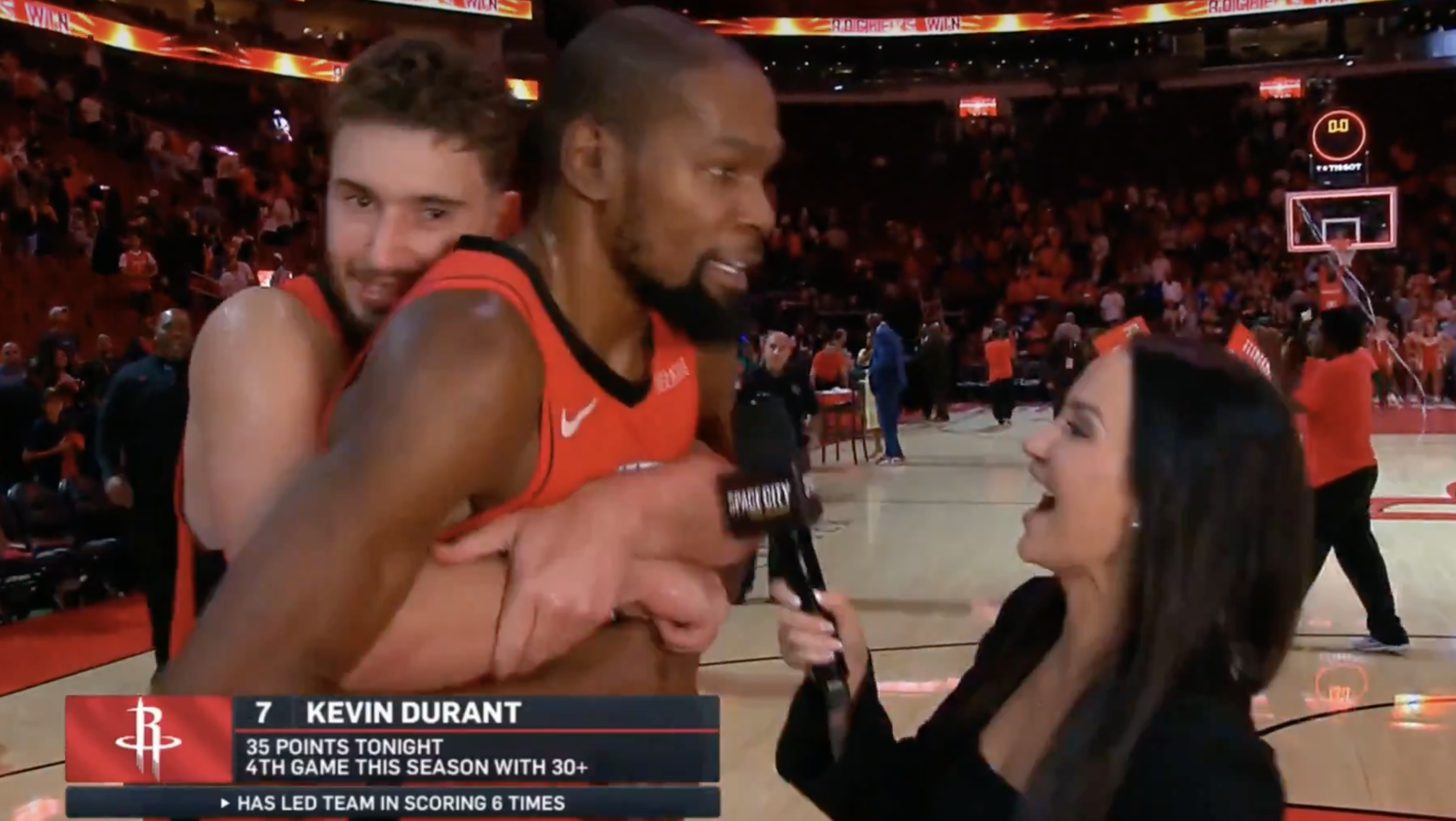 賽后凱文-杜蘭特在接受記者采訪時(shí),申京闖入擁抱杜蘭特。