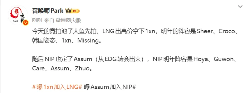 博主召喚師Park爆料:今天的競拍池子大魚先拍,LNG出高價拿下1xn,明年的陣容是Sheer、Croco、韓國姿態(tài)、1xn、Missing。