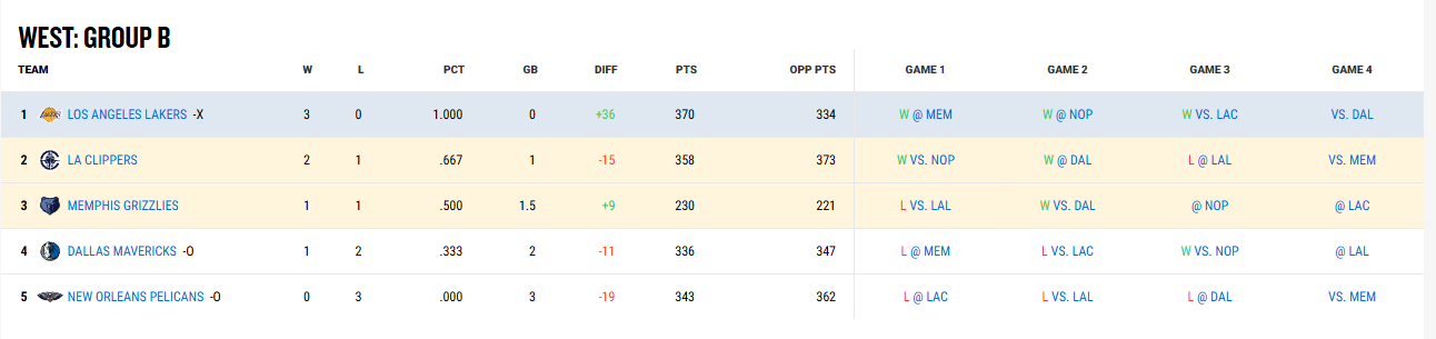 湖人贏得西部B組頭名,俠鵜成為首支晉級NBA杯淘汰賽階段的鶘淘西部球隊。