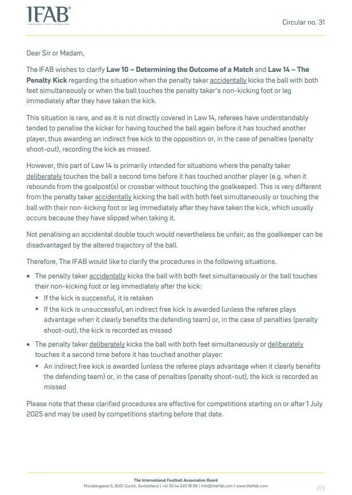 IFAB(國(guó)際足球聯(lián)合會(huì)理事會(huì))現(xiàn)就規(guī)則第10章“比賽結(jié)果判定”及第14章“點(diǎn)球罰球”中關(guān)于以下情形作出說(shuō)明:當(dāng)主罰隊(duì)員意外用雙腳觸球,或在踢出點(diǎn)球后球立即觸及非主踢腳/腿。