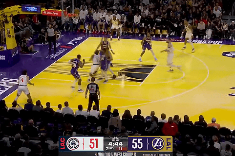 虎撲11月26日訊 NBA杯小組賽,湖人對(duì)陣快船的單挑比賽正在進(jìn)行中。