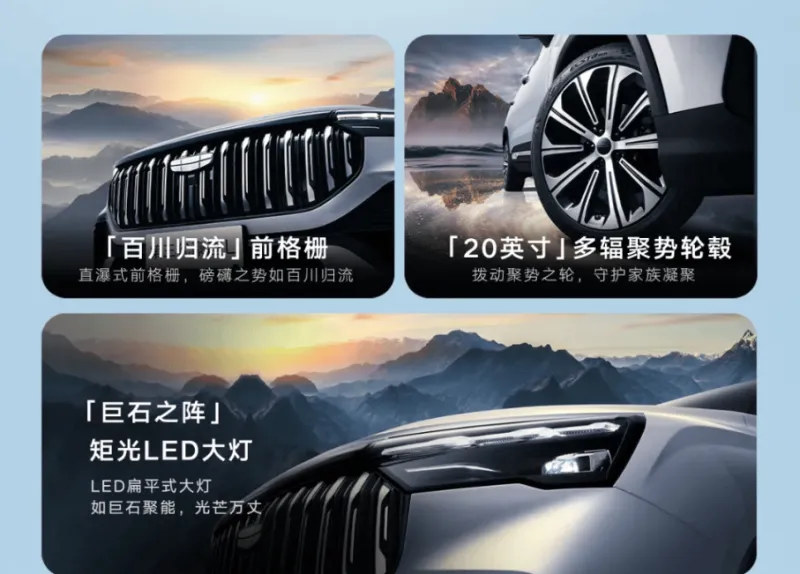 新款豪越 L 在外觀設(shè)計(jì)上延續(xù)了吉利品牌標(biāo)志性的“天地美學(xué)”理念,前臉部分,文匯大尺寸多邊形前格柵搭配直瀑式中網(wǎng),總新與兩側(cè)大燈組融為一體,款吉大燈內(nèi)部的利豪星河矩陣 LED 燈組科技感十足。