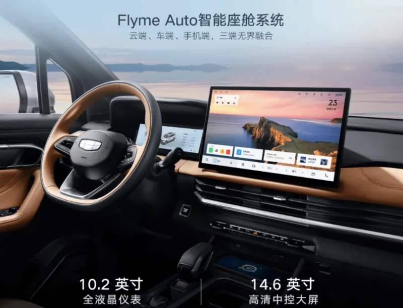 車內(nèi)配備 10.2 英寸全液晶動(dòng)態(tài)組合儀表和雙色三輻式多功能平底方向盤,中控臺(tái)中間的 14.6 英寸多媒體觸控屏內(nèi)置 Flyme Auto 智能座艙系統(tǒng),支持智能語(yǔ)音交互、無(wú)界空間、高德在線實(shí)時(shí)導(dǎo)航以及智能手機(jī)互聯(lián)等功能。
