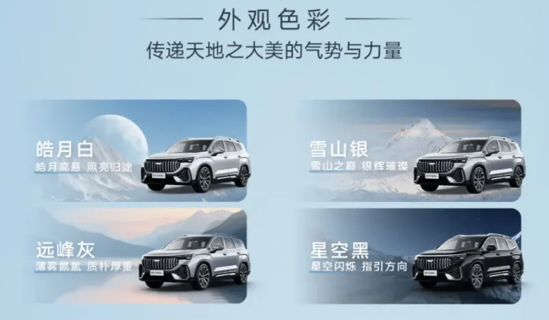 此外,新車提供皓月白、星空黑、雪山銀、遠(yuǎn)峰灰四種車身顏色。