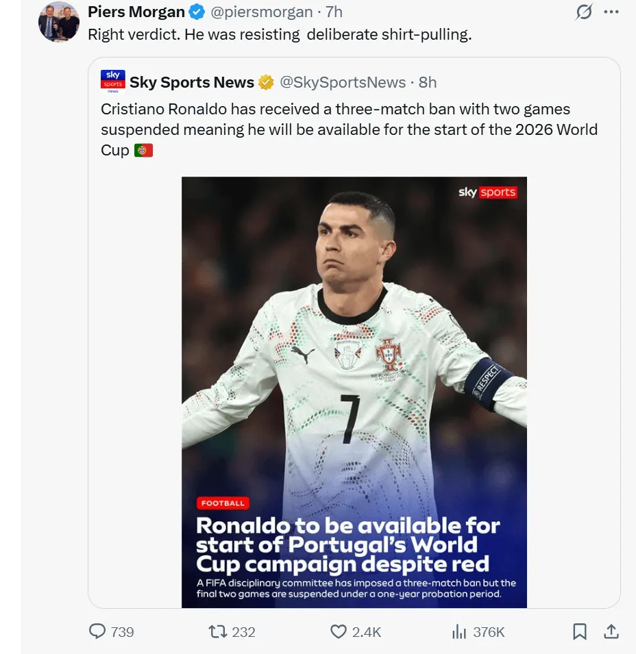 對此,著名主持人皮爾斯-摩根也在社媒上表示:“這判罰是很正確的,C羅當(dāng)時是在反抗對方故意拉扯球衣的行為?!?/p>