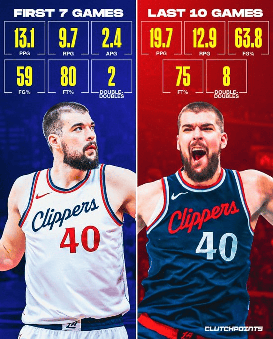 根據(jù)數(shù)據(jù)統(tǒng)計(jì),祖巴茨前7場(chǎng)13.1分9.7板2次兩雙,近10場(chǎng)19.7分12.9板8次兩雙。